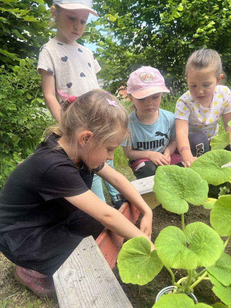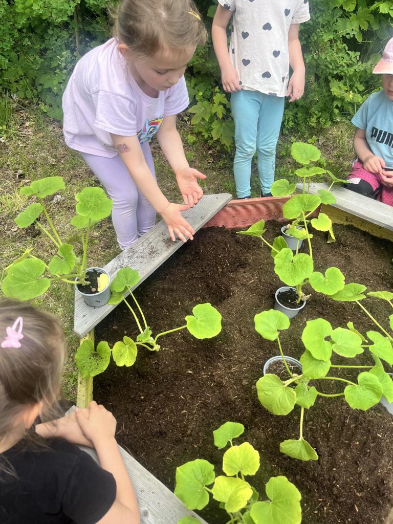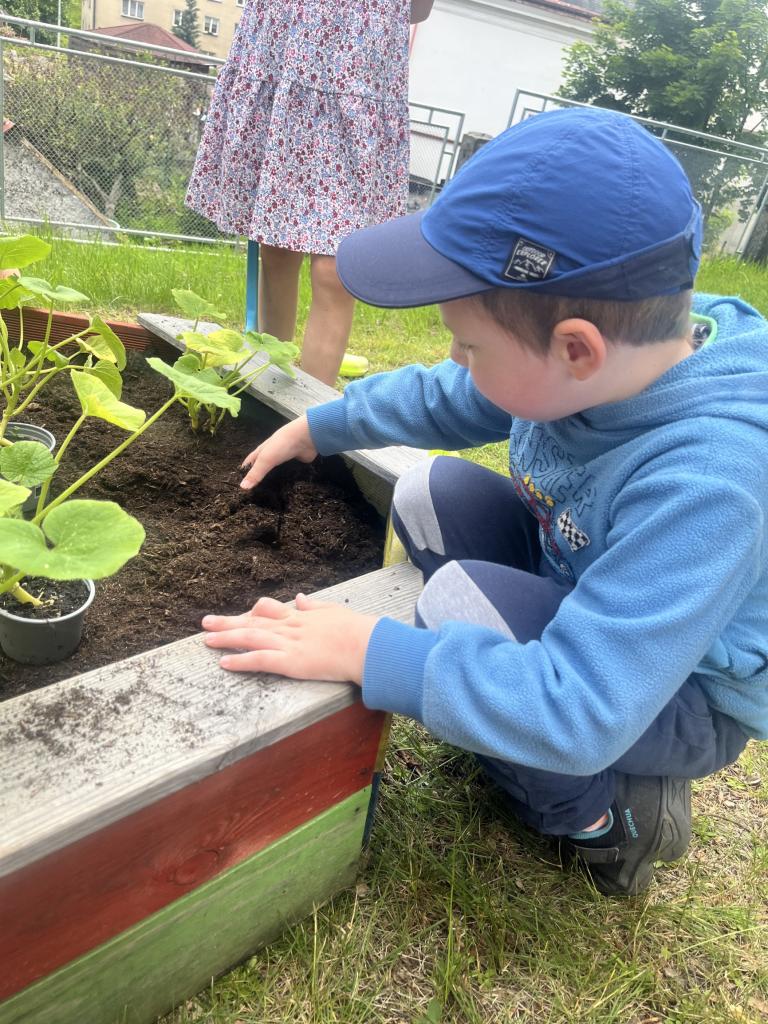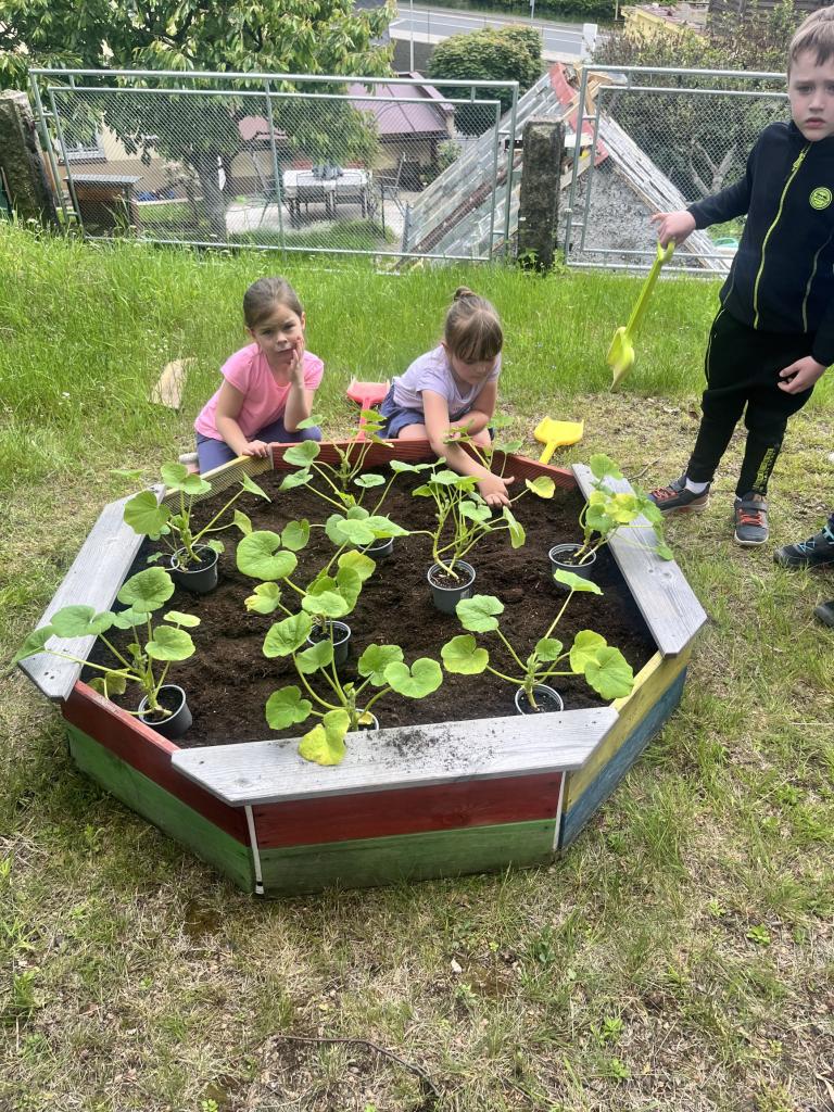 V týdnu si děti připravily záhonky, kde pěstují dýně a cuketky. Doufám, že na podzim využijeme budoucí plody a čeká nas pořádné dýňobraní.